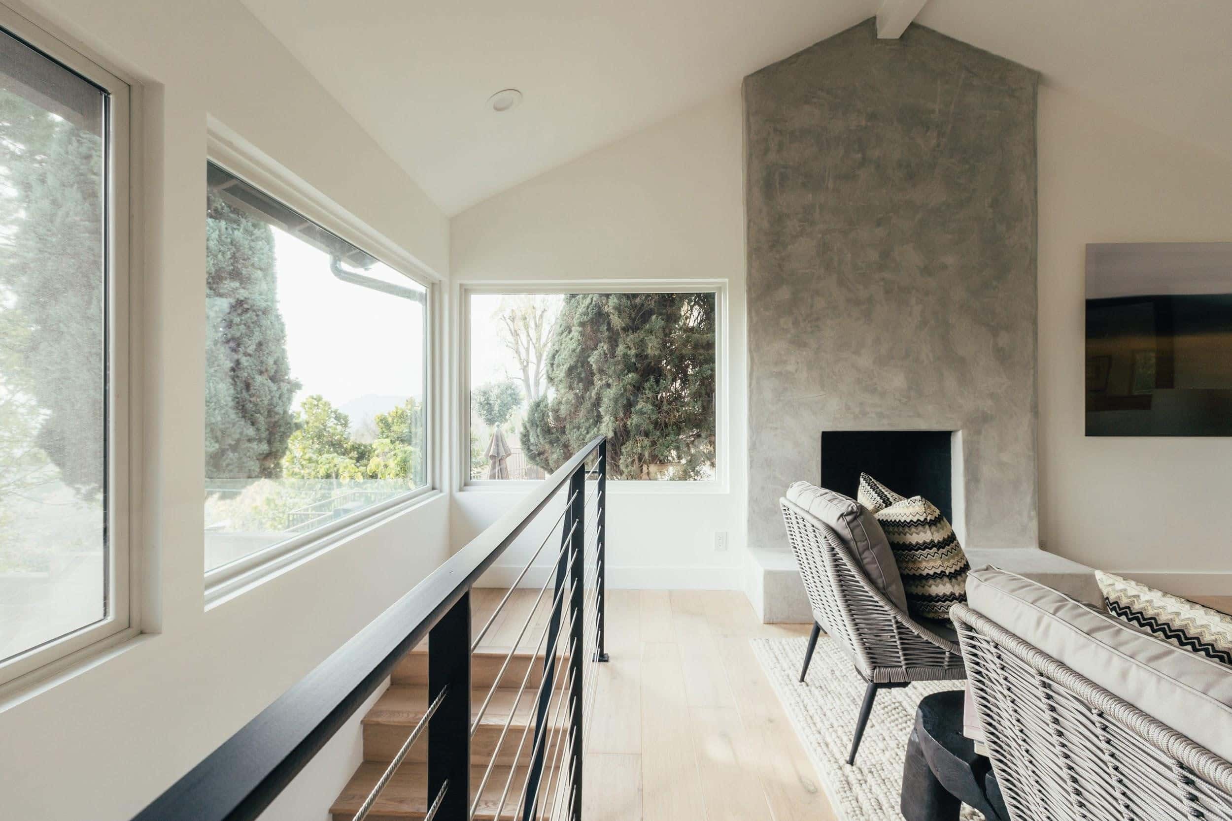 Along with creating a sleek design and modern look, comes the deck and/or stair railing. The railing is a crucial element of your indoor/outdoor spaces overall design and how you use it is of utmost importance. When trying to create the illusion of the indoors being out or vice versa, you want clean and simple, an option that doesn’t distract or obstruct the surrounding beauty.  Another tip is to use the same railing on the inside staircase, as you would on the deck railing like we did here. It really blends the two spaces and makes for a more cohesive indoor/outdoor experience.