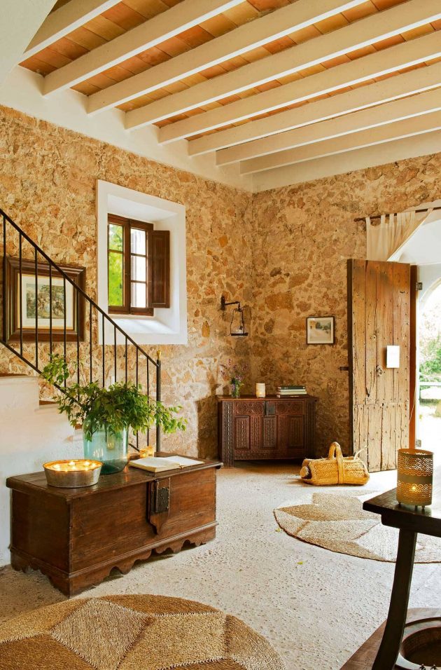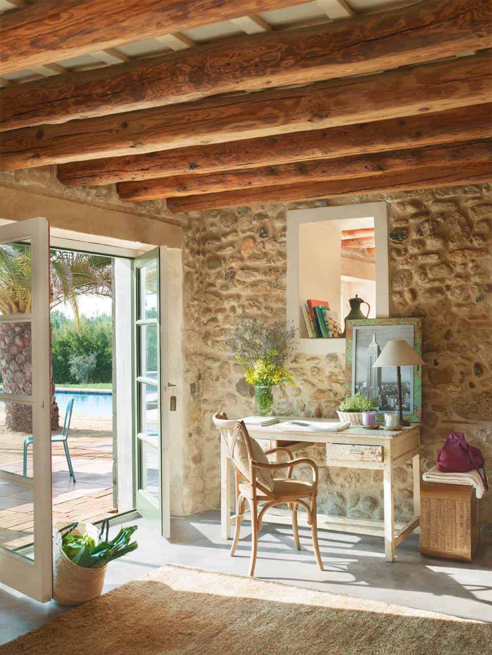 How cool and cozy stone houses are in summer! A very grateful material that insulates from the suffocating heat. And if you saw the interior walls above, as in this hall, all the better. In it, a niche has been opened to the outside that serves as a mini bookcase and extra ventilation. The space has been furnished with an antique kitchen table and a chair, as a desk. A vase of wildflowers brightens up space.