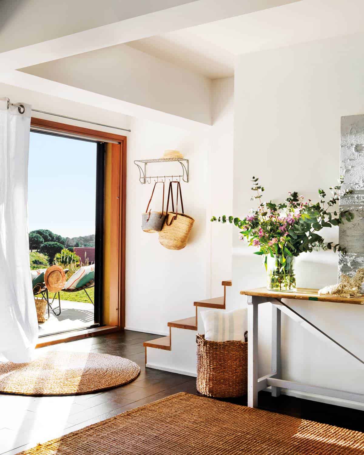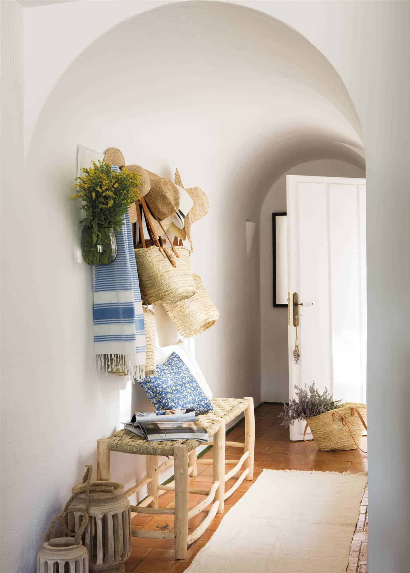 In this hall, you can see the visual strength provided by two simple natural wood benches with seats braided with ropes. They are only accompanied by a white coat rack that blends in with the wall and blurs behind the hats. Baskets and flowers do the rest.