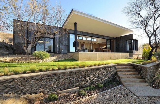 Passive design principles employed include a ventilated steel-clad façade, solar water heating and appropriate shading devices. All stone used are from the site; precast concrete fence panels were reused as stepping-stones across the lawn; the front door is a salvaged prison gate; the clay brick used is from a rehabilitation project where clay is extracted from old mine slime dams. Framed steel mesh panels are used for security and fencing.