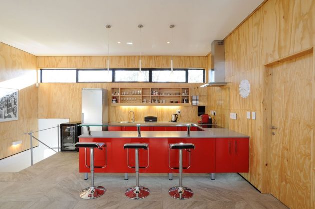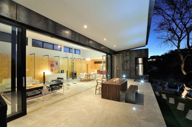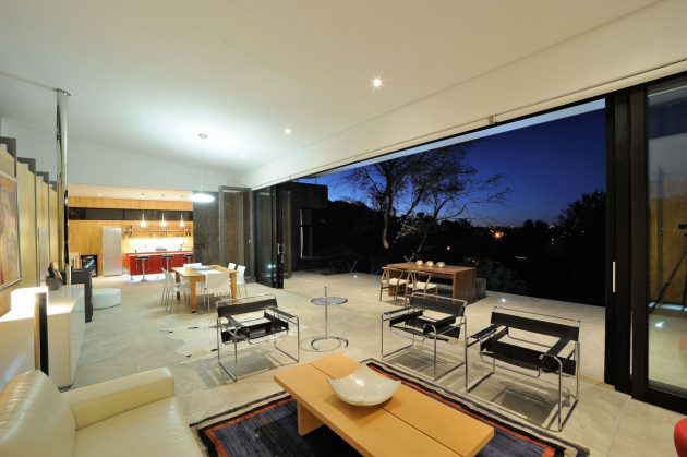 From the architects: “Prominent features of the site include a rocky ‘koppie’ that separates the house from the neighbouring residence and a pronounced fall towards the north. Located on the highest portion of the site, the house enjoys north orientation and beautiful views across the Klein Windhoek valley.
