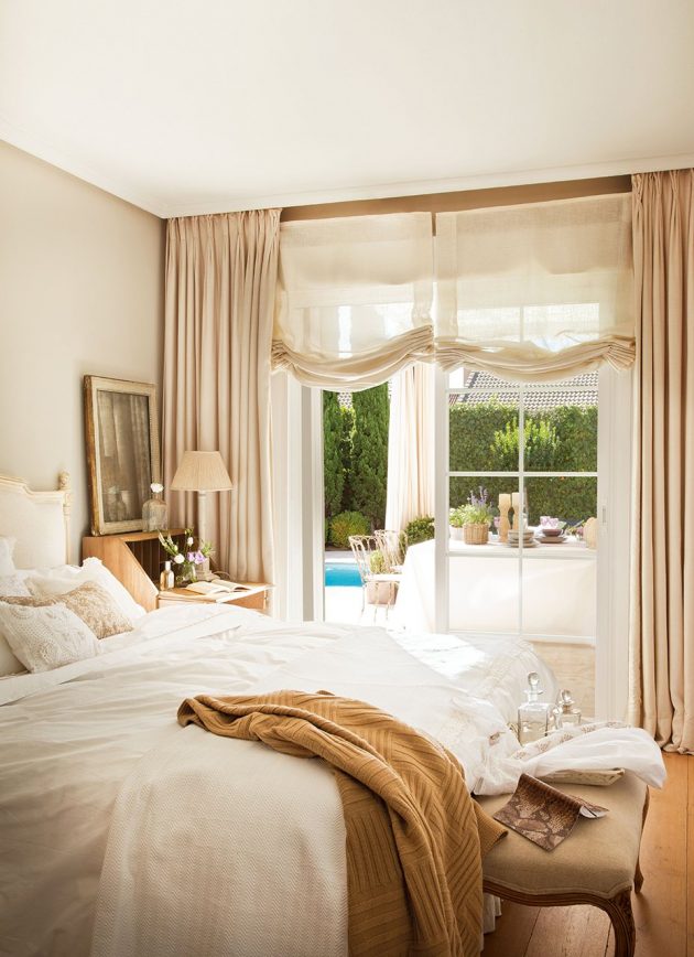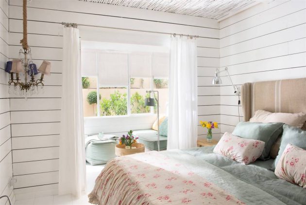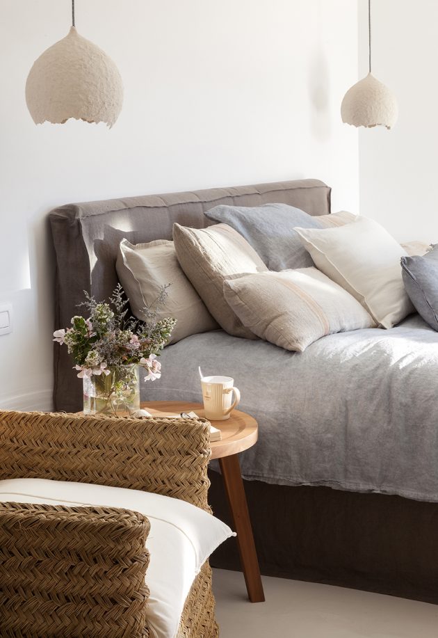 That it is small does not mean that it cannot be very stylish. This is demonstrated by this bedroom, which breathes a vintage air that makes it very special. The original ceiling lamp and the wing headboard upholstered with antique linen add a special space.
