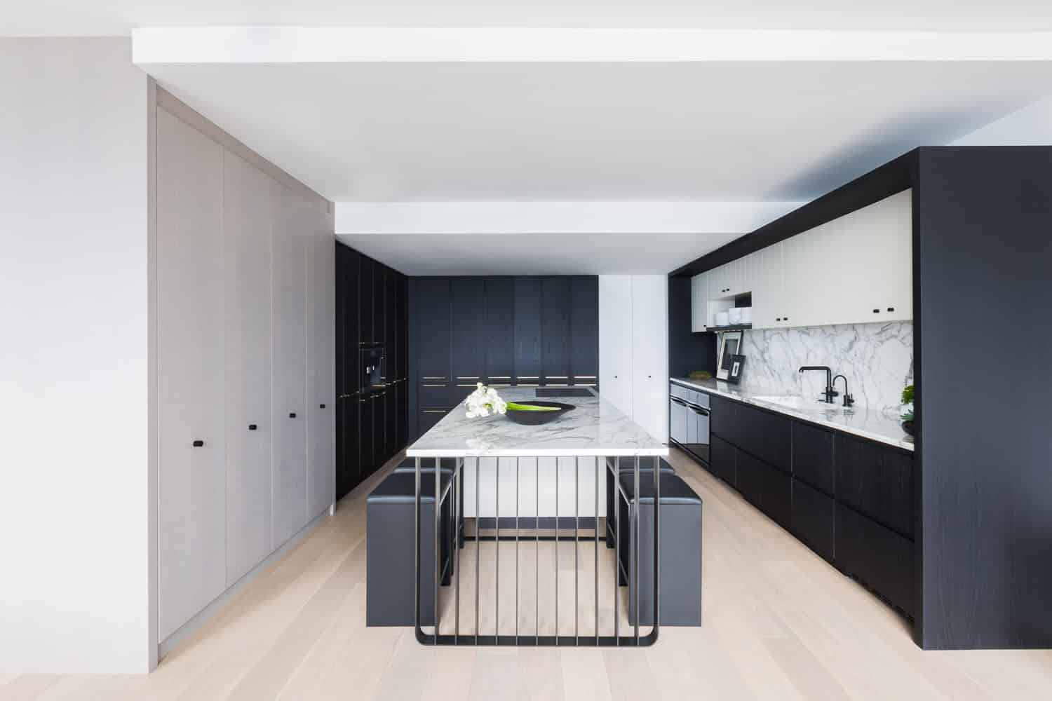 Spatially distribute black and white colors on all the cabinets in the kitchen. Leave the island at the centre red with a white (patterned or non-patterned) slab over it.