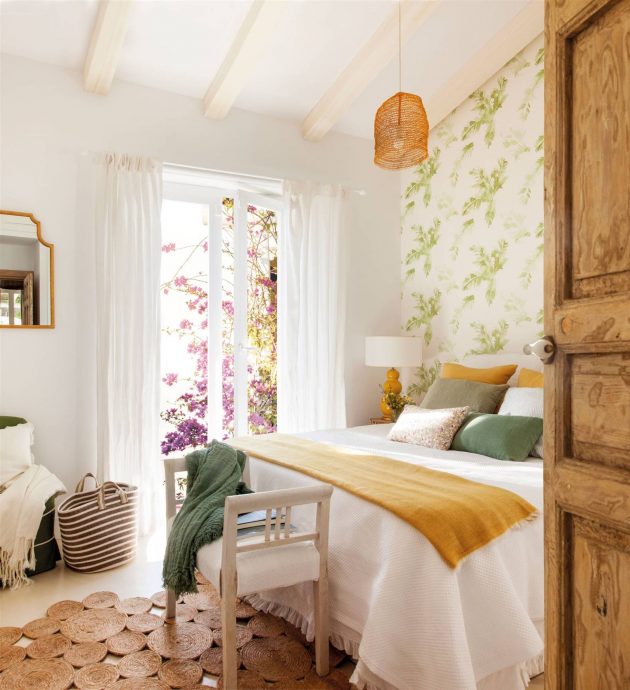 The grayish-blue Provençal of the doors is what has marked the decoration of this bedroom, where the white furniture has been colored with a floral wallpaper that covers the headboard wall without cluttering the space.