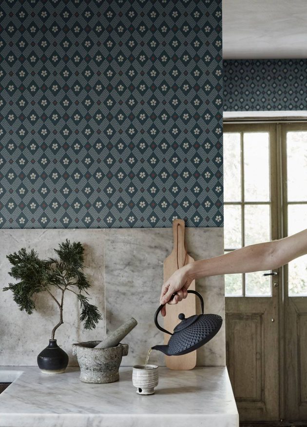 It is the Kimono wallpaper that makes this kitchen look like our dreams. The paper can be found in three different colors: deep blue, like the one in the image, green, or linen.