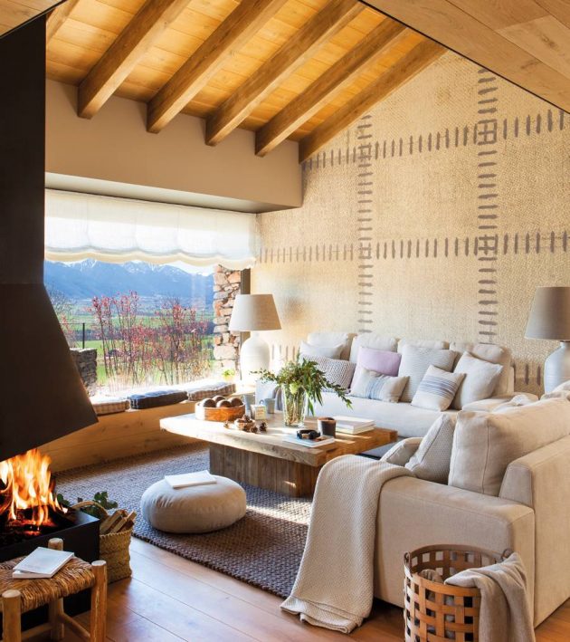 The decorator decided to give this living room in a mountain house an extra warmth by covering the wall of the sofa with an original wallpaper that imitates jute. As the wall is so high, this paper contributes to making it look more welcoming.