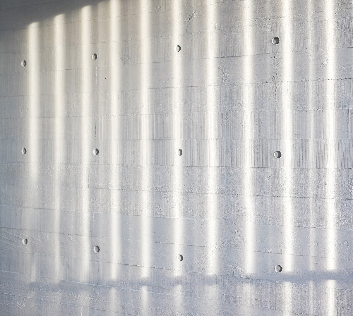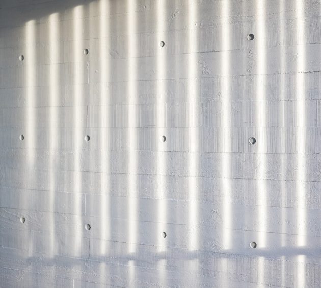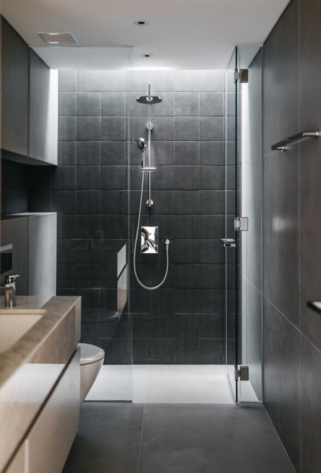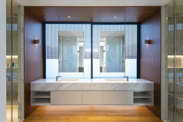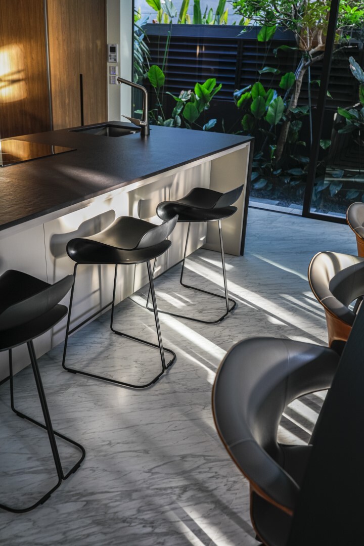 Across the first level, white marble floors contrast perfectly with the matte black of the steel window frames and pillars. In the powder room, Gessi fittings in a customised brushed black nickel finish lend a sophisticated elegance against the Calacutta marble tiles. Selected walls were left in a béton brut style, but with the exposed concrete given a special SKK finishing coat, locking in the textured appeal of its timber mold.