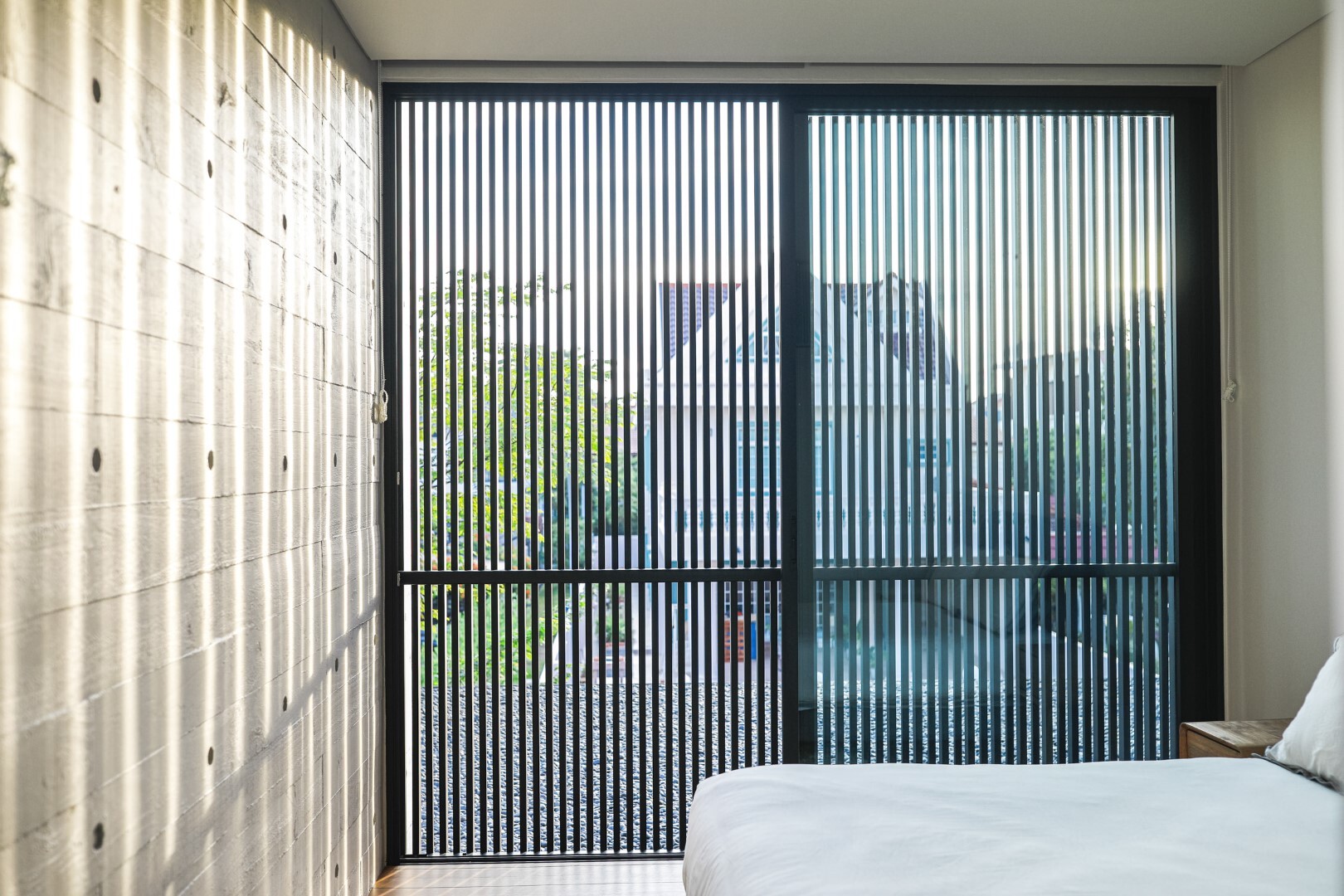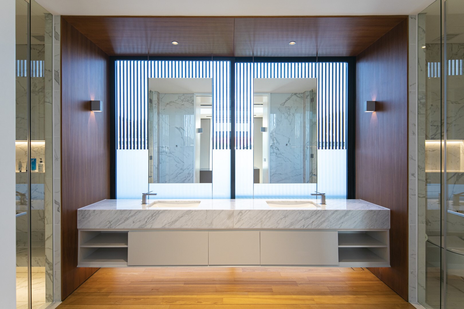 Ascending the stairs, the flooring changes to grooved teak planks, indicating a switch to the more private areas of the house. The second level features a generous guest bedroom and bathroom with sun pipe for natural illumination at the front, while a discreet pocket door slides to reveal two multi-purpose areas currently used as home offices. Beyond them, a spectacular glass bridge across the courtyard leads to the principal bedroom – a double-volume space with curved ceiling. Behind another set of pocket doors lie an expansive walk-in closet with Fenix laminate doors and a glass skylight above, and a master bathroom with dual vanity areas.