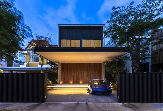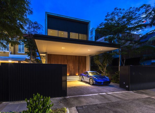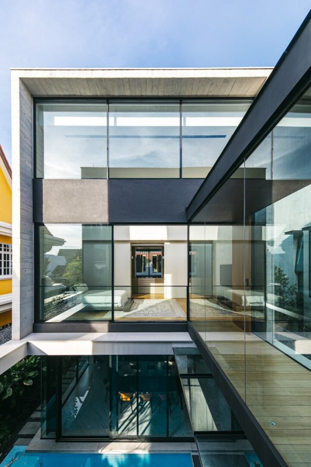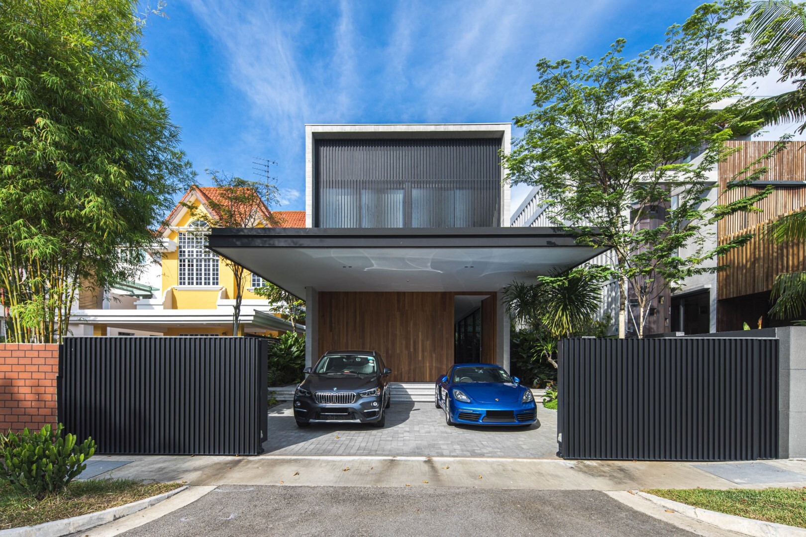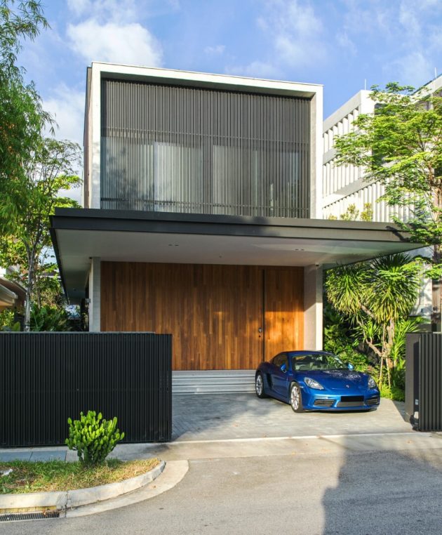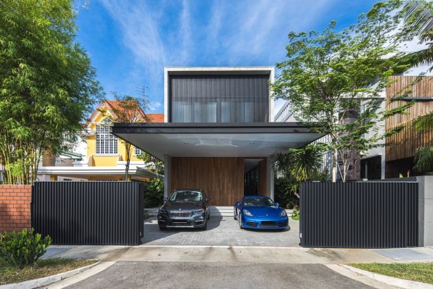 Built on a level but long plot of land in the East Coast area of Singapore, 105DW-House presented a few challenges to the architecture team. A southwest-facing frontage meant that any windows on its facade would require some form of brise soleil to deflect the harsh afternoon sunlight. To overcome this, the designers opted to place a swimming pool and a Frangipani tree in the centre of the house, creating a courtyard-style focal point and effectively turning the view inwards. The pool features a bridge connecting the living room to the dining room with separate dry and wet kitchens, and service areas towards the back.