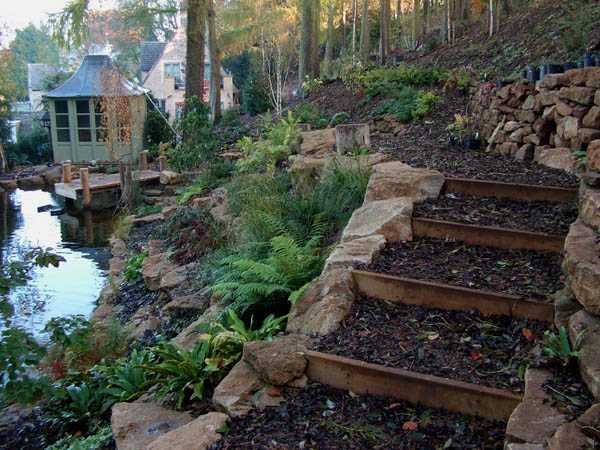 Stairs in the garden facilitates to overcome the difference in the height. Walking in the gardens on the grass is unfavorable, in rainy weather and even dangerous. Construction of the garden steps can be very challenging and and it is hard to make them equal if the height is bigger. For the stairs we can use different materials. The most suitable materials are the stone and the wood. If you use a stone or concrete slabs, the process of making will be very simple. Wooden stairs also are easy to make, but need more maintenance and on the rain will be slippery. The most stable are stone steps.