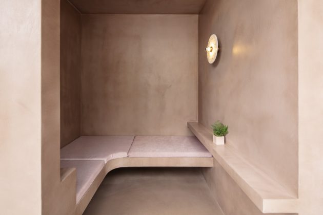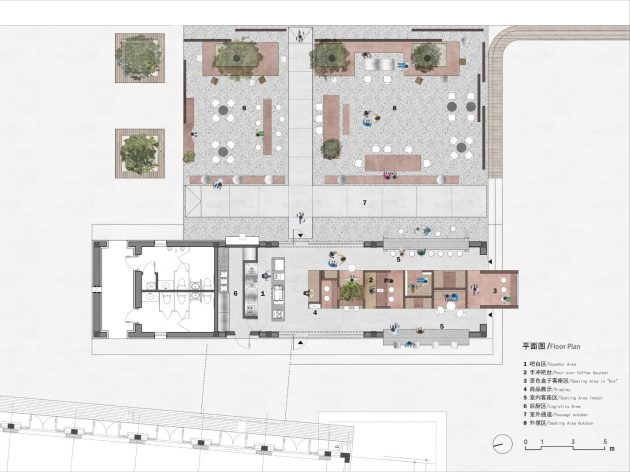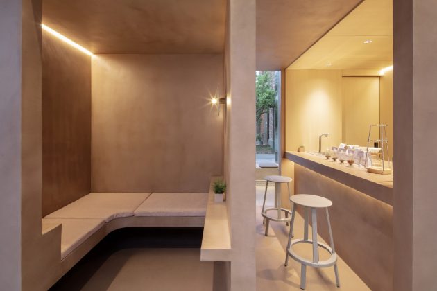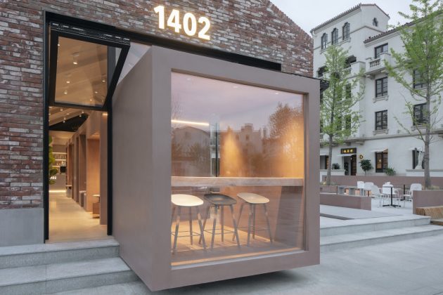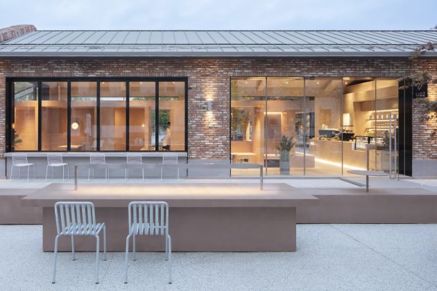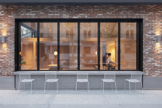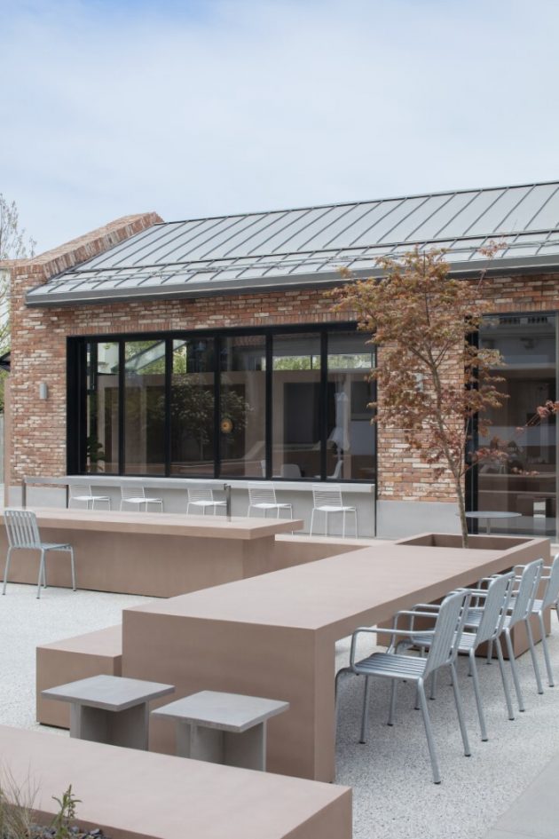 B.L.U.E. Architecture Studio introduced a rectangular cement box made of pigmented Dagu concrete inside the red brick shell. This new volume organizes the café’s functions—seating, pour-over bar, waiting zone, and display—while offering guests varied spatial experiences.
