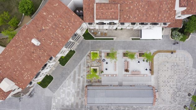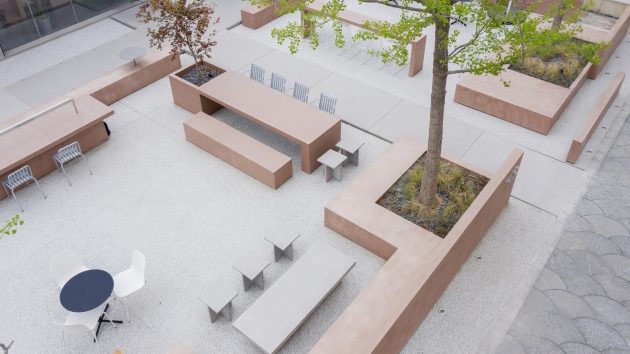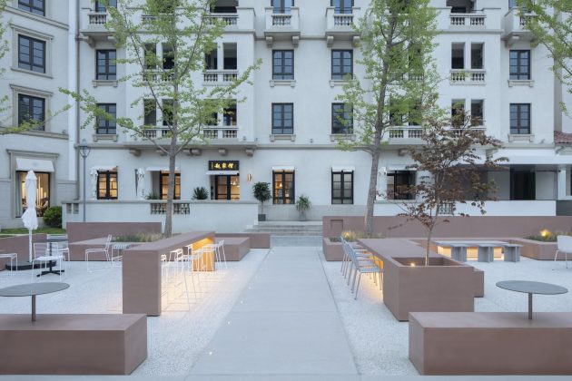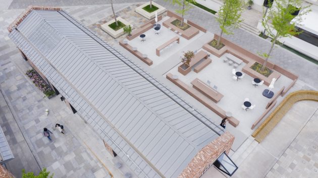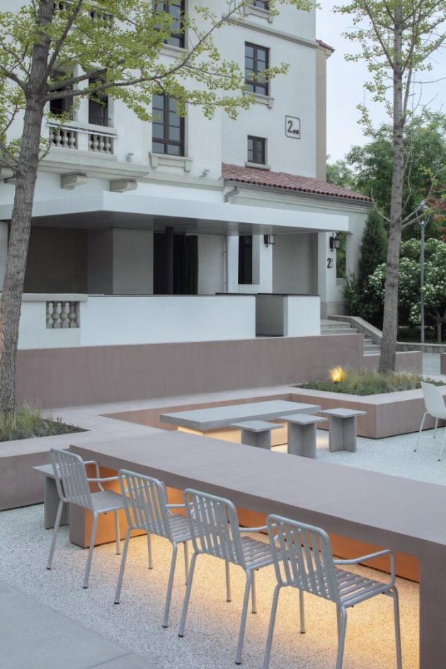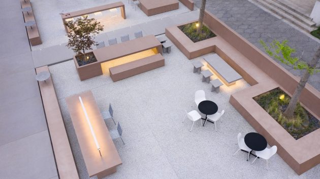 The renovation extends beyond the building to a cross-shaped outdoor platform that divides the courtyard into four seating zones. This layout maintains visual continuity while offering variety in scale and atmosphere.