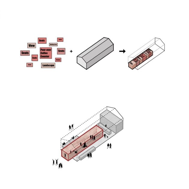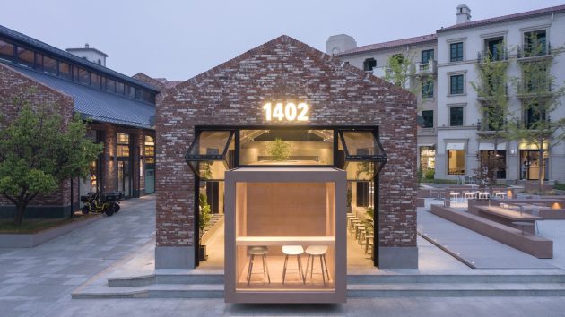 Located near the west gate of Aranya community in Qinhuangdao, 1402 Coffee Shop occupies an existing red brick building with a sloping roof. Once a modest structure, the building has been reimagined as a cultural landmark for locals and visitors. The renovation embraces contrast—old brick meets new cement, rustic shell meets minimalist insertion—establishing a bold architectural identity along the main road to the coast.