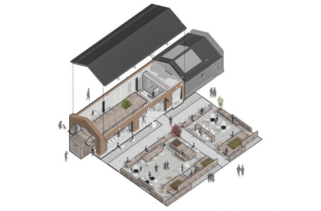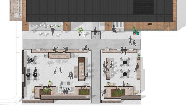 Transparency & interaction: A new glass facade with operable folding doors connects the café interior with both the square and outdoor seating, erasing boundaries between inside and out.