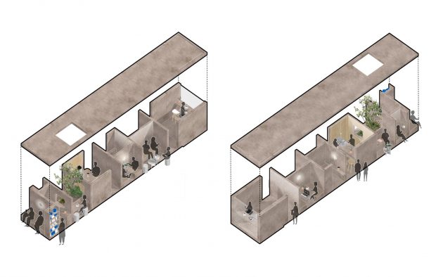 Layered enclosure: Partition walls of varying heights, bar tables, and benches create pockets of intimacy and openness, encouraging guests to explore and linger.