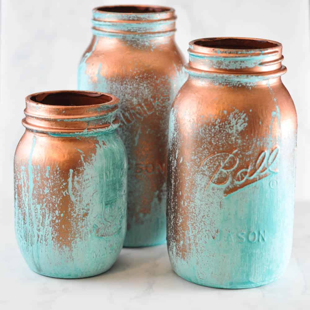 5. MASON JAR VASES WITH A BLUE PATINA DESIGN