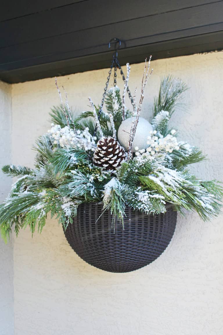 Another fun idea is to create “mini Christmas trees” by placing a cone-shaped piece of styrofoam or chicken wire inside the planter and wrapping it with greenery or tinsel. This affordable DIY project is an easy way to make your outdoor decor feel more festive and full.