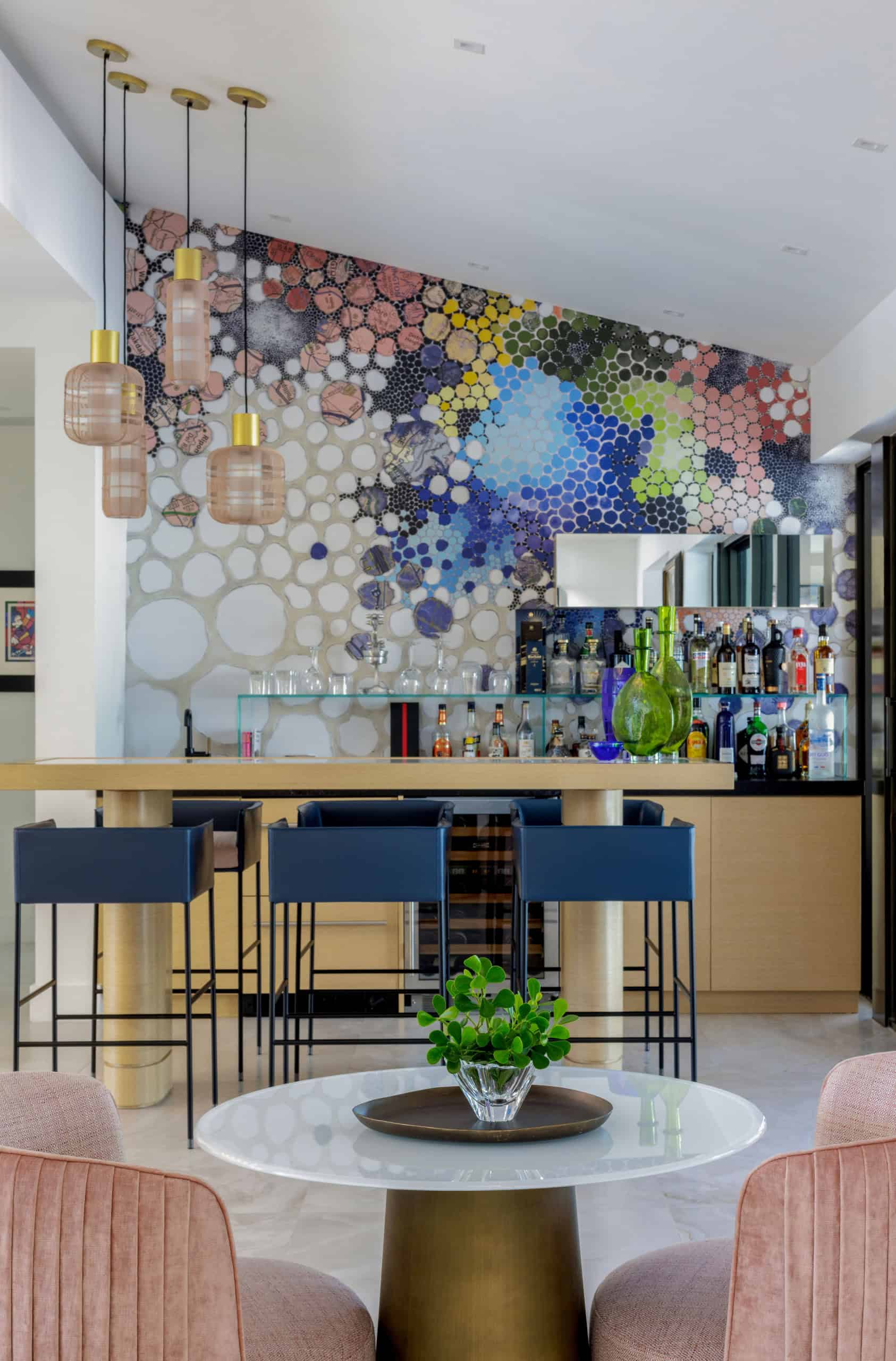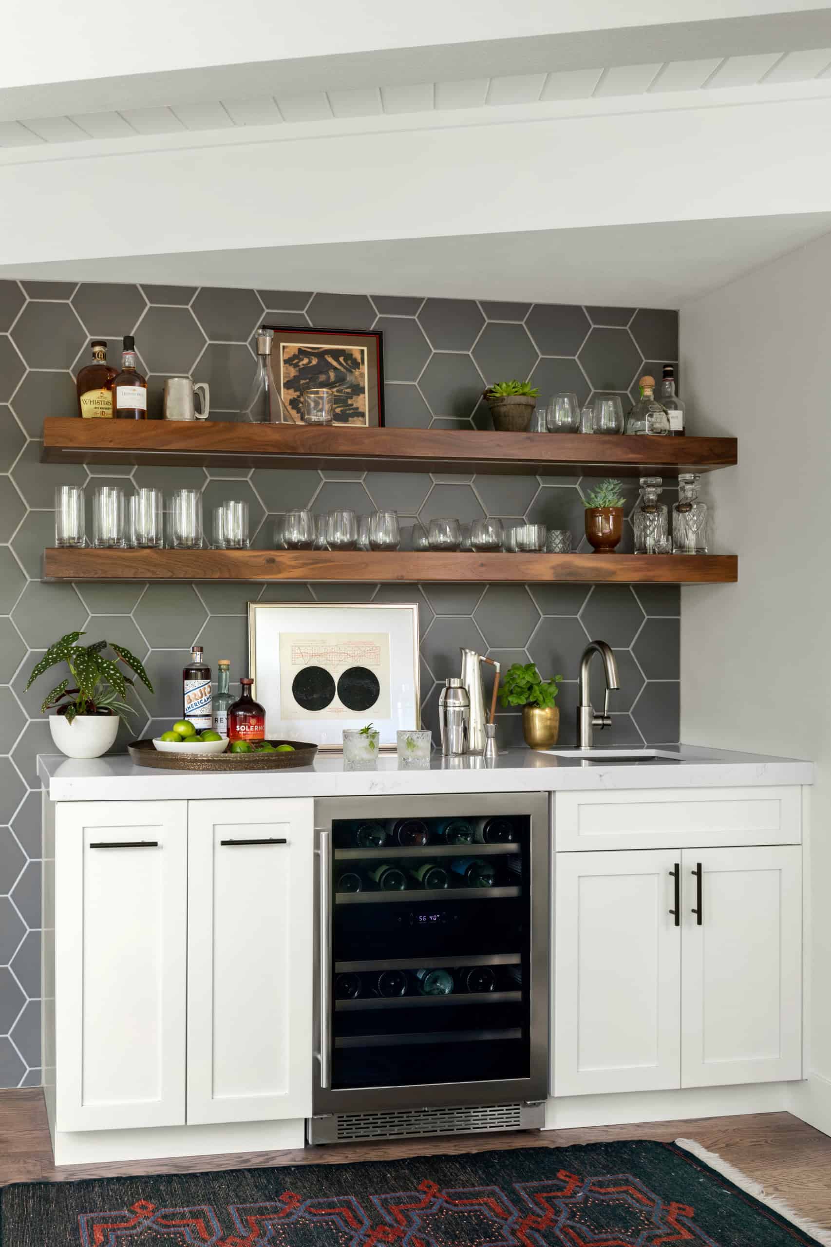 Paint the walls in a soft neutral shade to allow colorful decor and furniture to shine. Alternatively, consider using wallpaper with midcentury patterns, such as geometric shapes or abstract designs, to make a statement. This colorful approach not only adds personality to your bar but also connects it with the overall decor of your midcentury kitchen and dining room.
