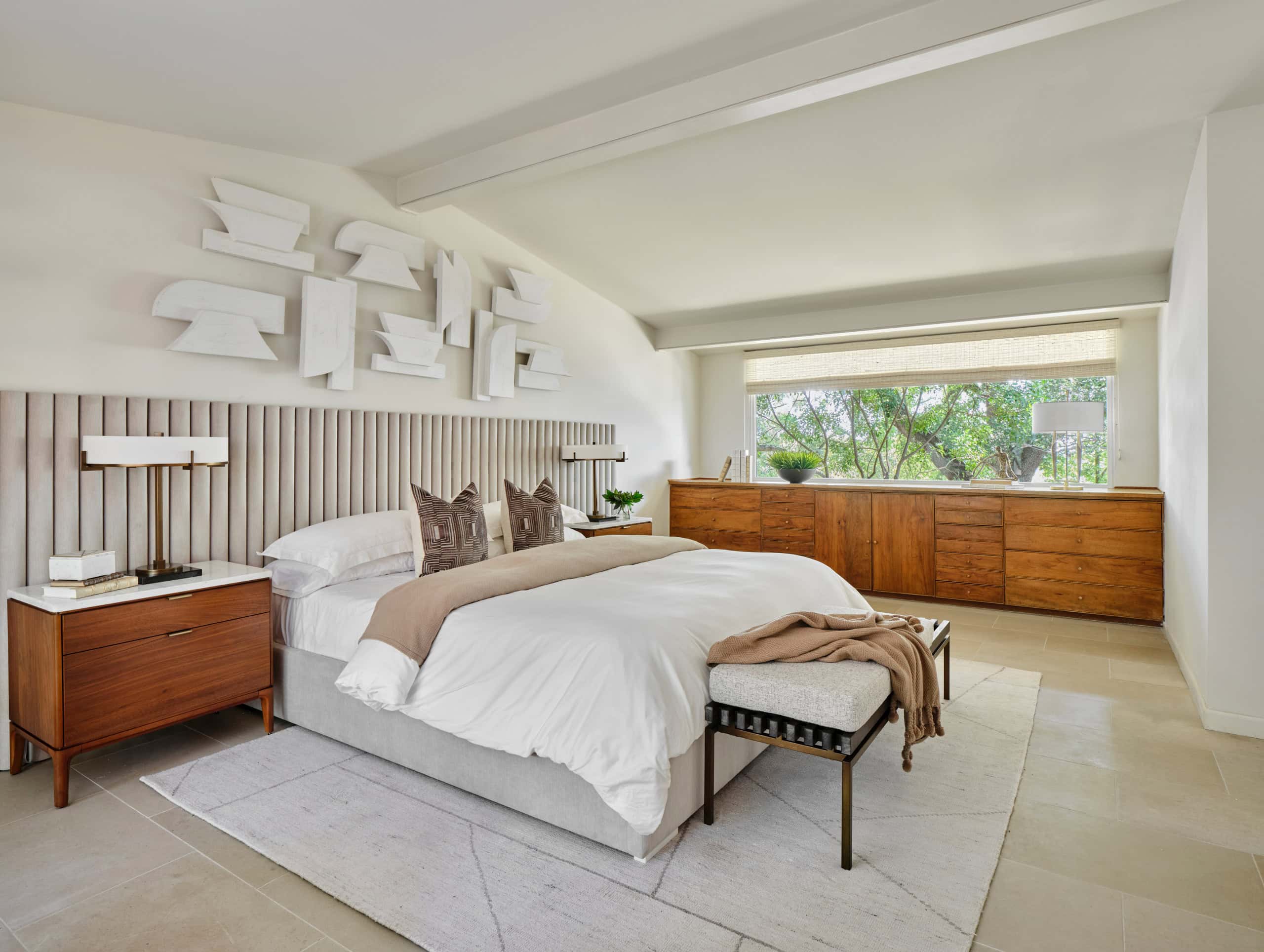 In addition to traditional wood furniture, consider mixing in other materials commonly associated with mid-century design, such as leather, glass, and metal. A leather headboard or a glass-topped side table can add a layer of sophistication and help to balance the room’s overall design.