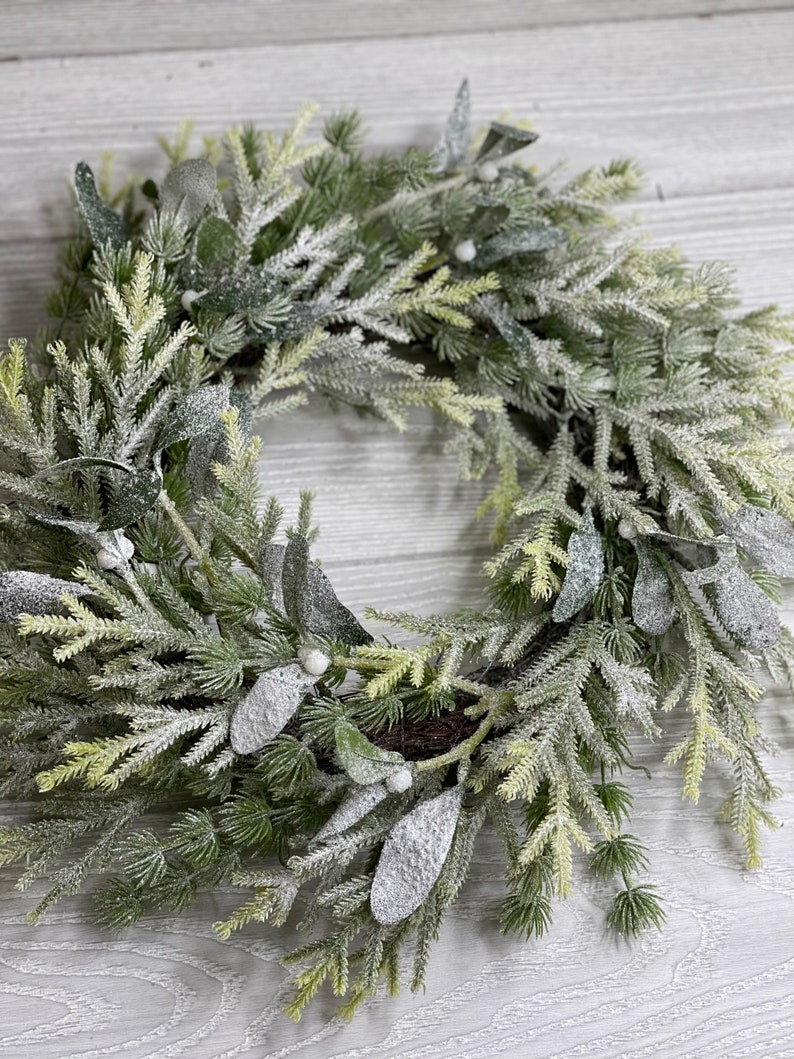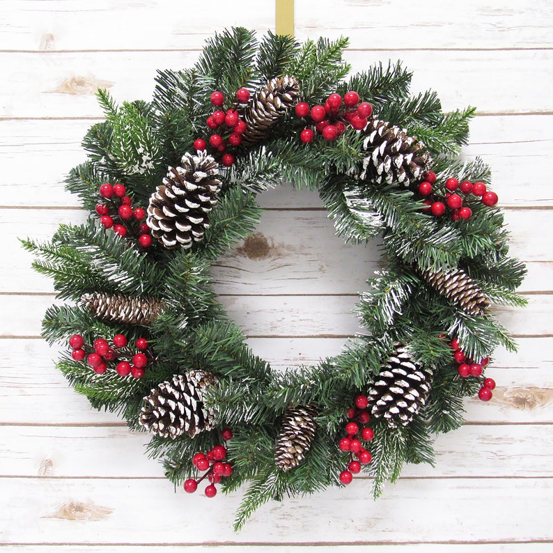 11. Faux Frosted Pine Wreath with Berry and Pine Cones
