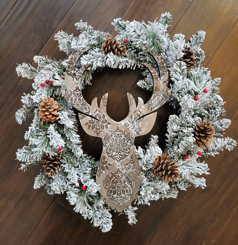 7. Winter Wonderland Deer Head Flocked Pine Wreath with Pine Cone and Red Winterberry Accents