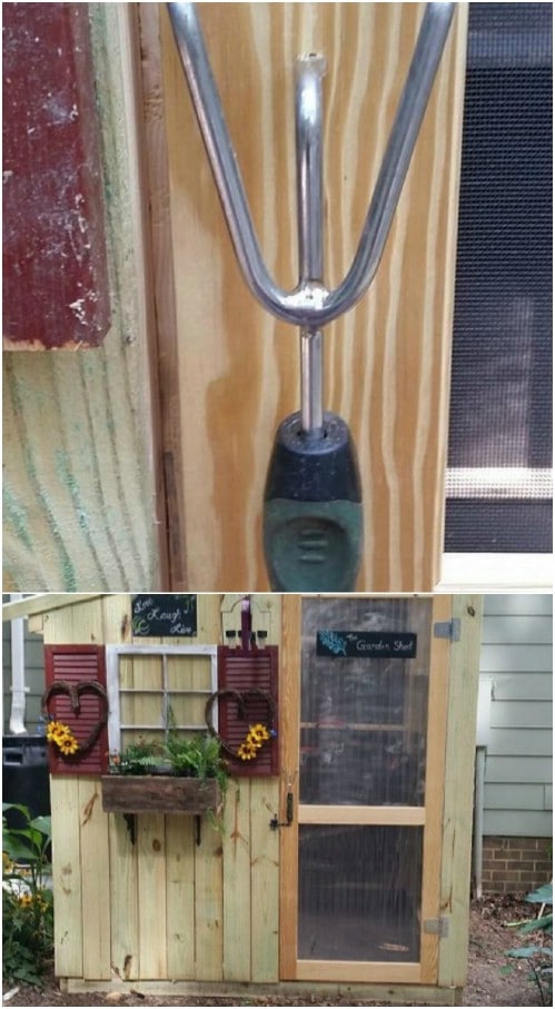4. Use a garden tool as a door handle for your shed