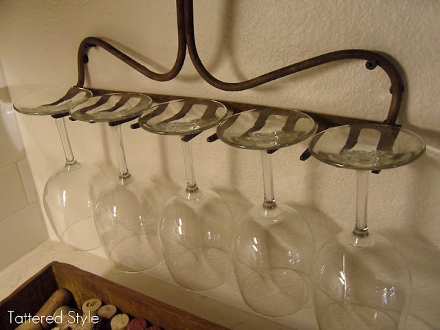 5. Upcycle a garden rake as a wine glass rack