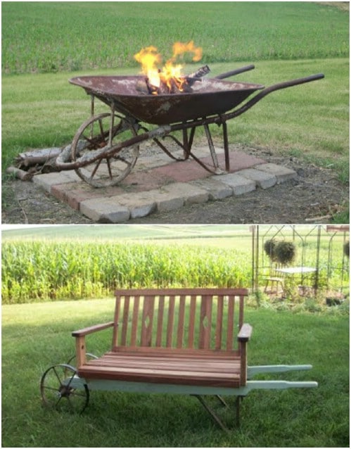 6. Repurpose an old wheelbarrow into a garden fire pit or a movable bench