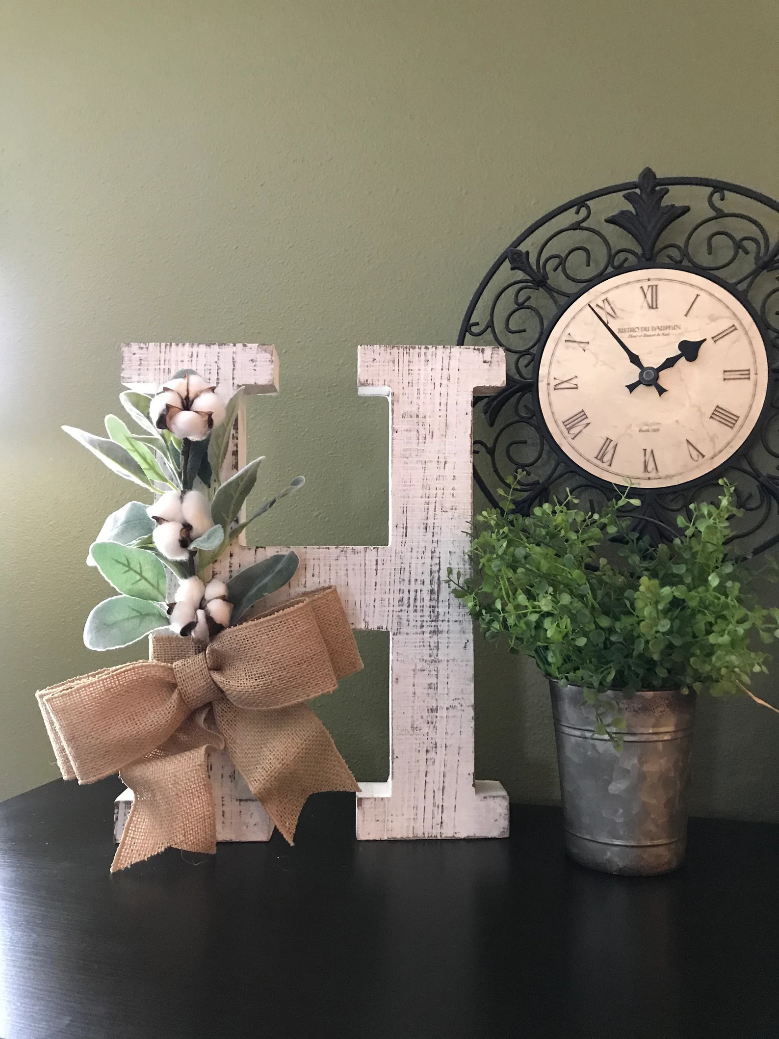 4. Free Standing Whitewashed Letter with Lambs Ear and Cotton Boll Stem