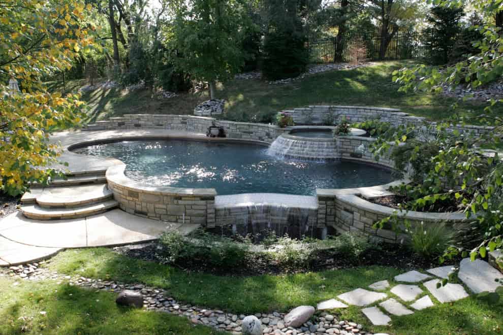 12. Elegant custom-shaped pool landscaping photo in St Louis