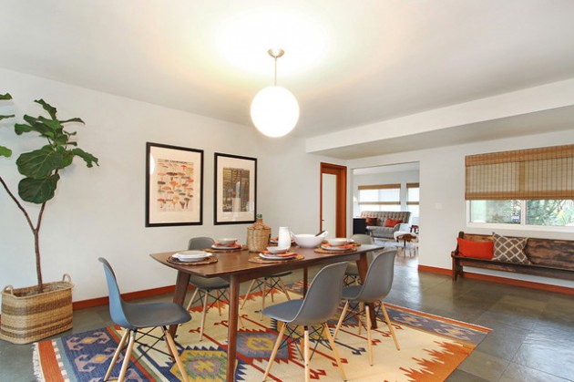 Bold Kilim Wool Rug with Eames Dining Chairs and Fiddle Leaf Fig