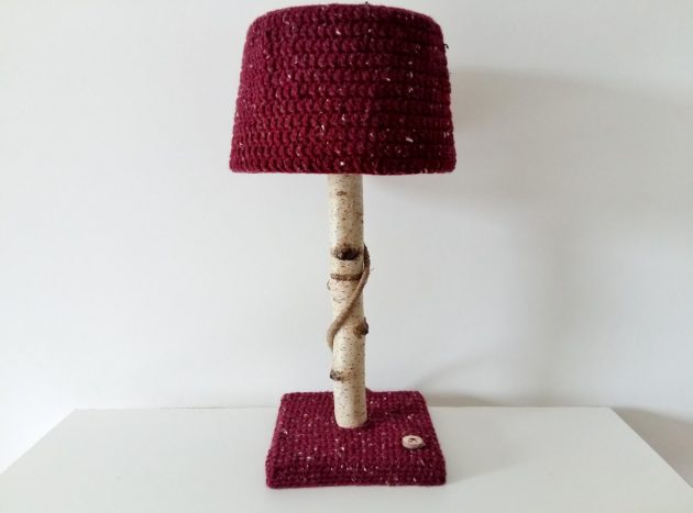 Lamp with birch tree branch and crochet lampshade – Handmade lighting