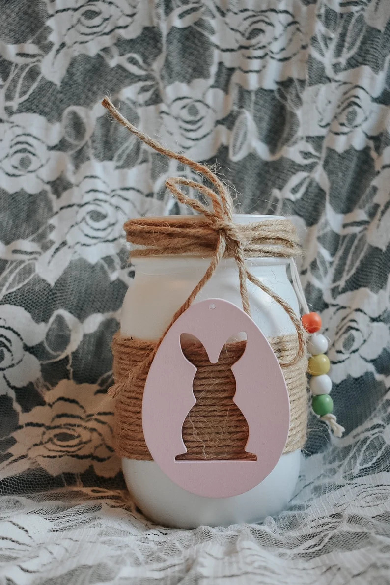 A simple yet charming Easter mason jar wrapped in twine and finished with a pink bunny egg tag — perfect for farmhouse spring decor.