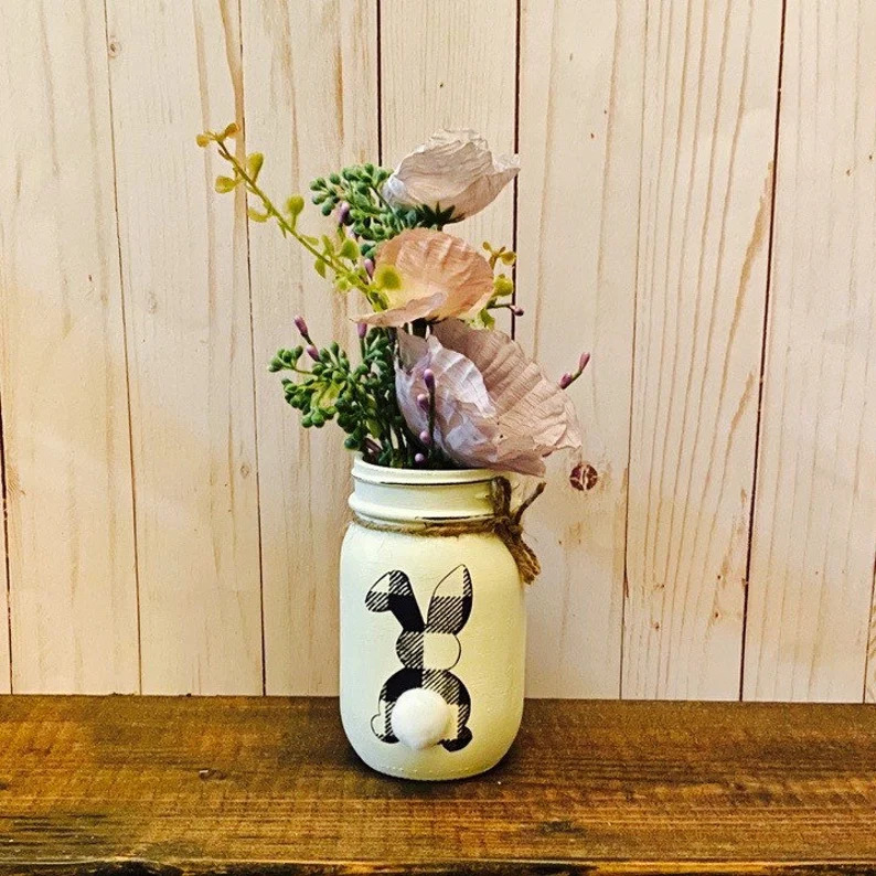These farmhouse-style mason jars feature black bunny silhouettes, spring florals, and gingham bows — perfect for classy Easter decorating.