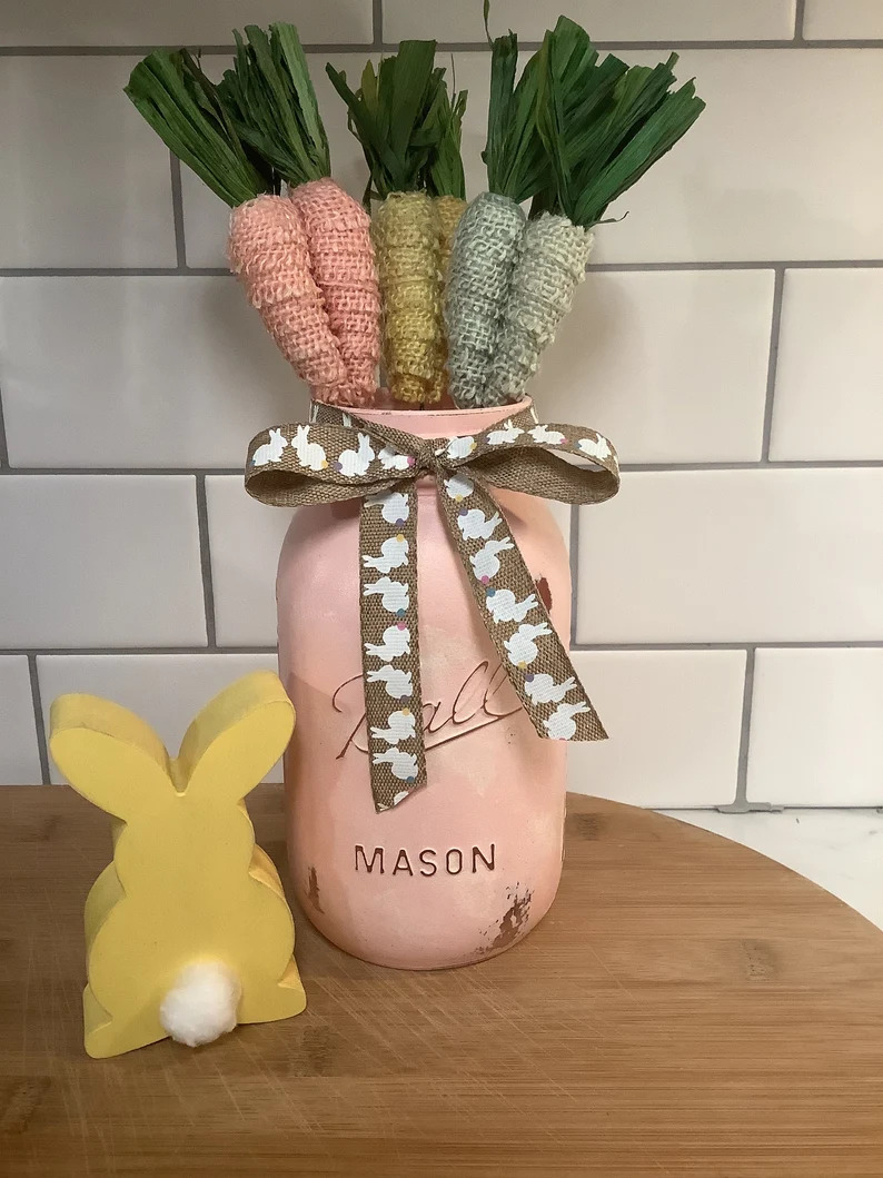 A charming farmhouse-inspired Easter centerpiece featuring a distressed pink mason jar filled with pastel burlap carrots and topped with a festive bunny ribbon—paired perfectly with a wooden yellow bunny.