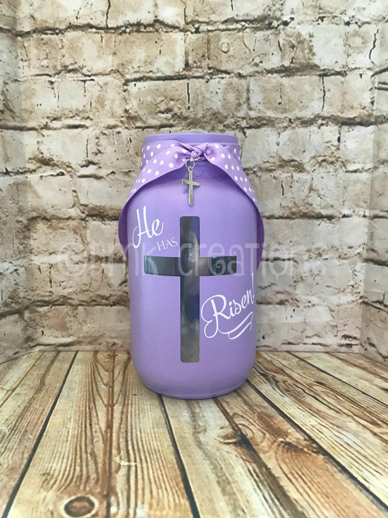 Purple Easter mason jar candle holder with cross design and He Has Risen message