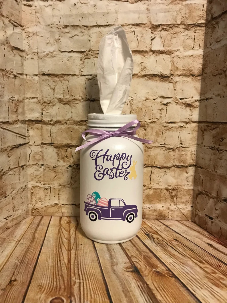 These colorful Easter mason jars feature playful sayings and bright spring tones — perfect for holiday decor, party favors, or candy jars.