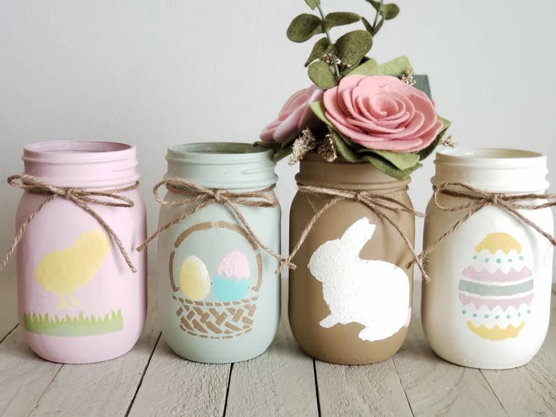 These soft pastel mason jars feature hand-painted Easter icons and rustic twine, blending minimal charm with seasonal spirit.