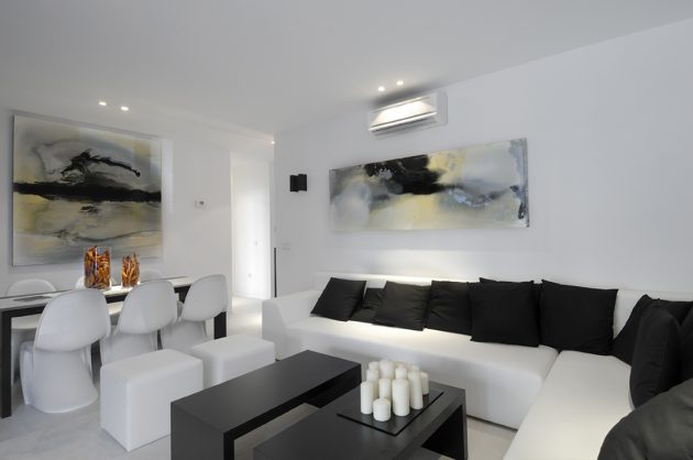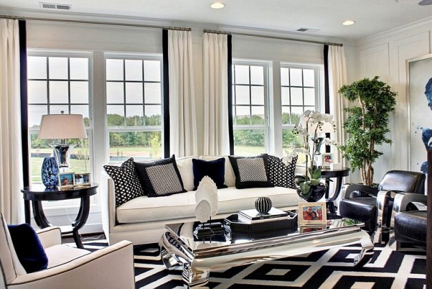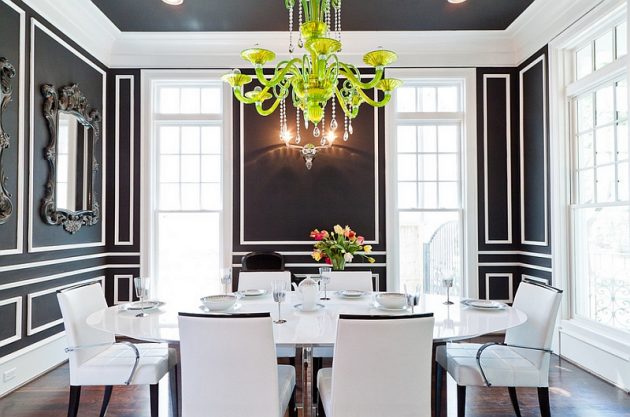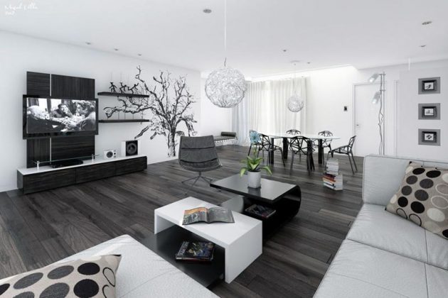 If you still like a bit more peaceful home atmosphere, then let one color to be dominant. It is much better to have a white base, black color should be there just to break the monotony. You need to have something black, part of a wall, a table, a pillow …. but be sure to have something which is a combination of black and white, that will connect the whole space. Also with black and white, you can add some color, it could be green plants or red vases with roses, a colorful pillow, chair, etc…