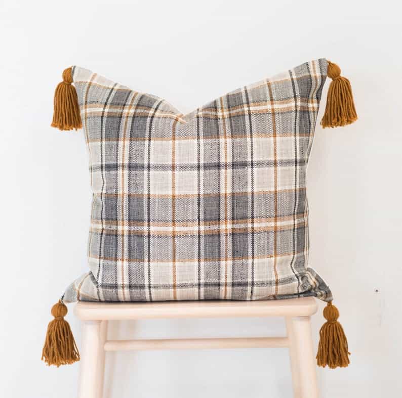 12. Plaid Caramel Orange Grey and Blue Pillow Cover with Caramel Tassels