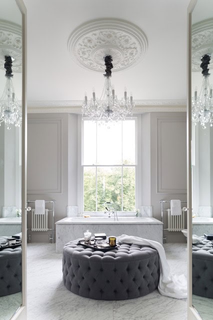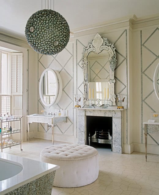 If you love to have glamor in your life, look no further than these glam bathrooms that most resembles the Holywood homes. Manly interesting patterns in shades of bright colors are hit, facing a dark background and white elements will perfectly fit into the environment. Super modern bathroom with separate bath and shower and a combination of concrete walls and glamorous chandelier does not lok like concrete industry anymore. On the contrary, with the right details it may seem sophisticated and glamorous.