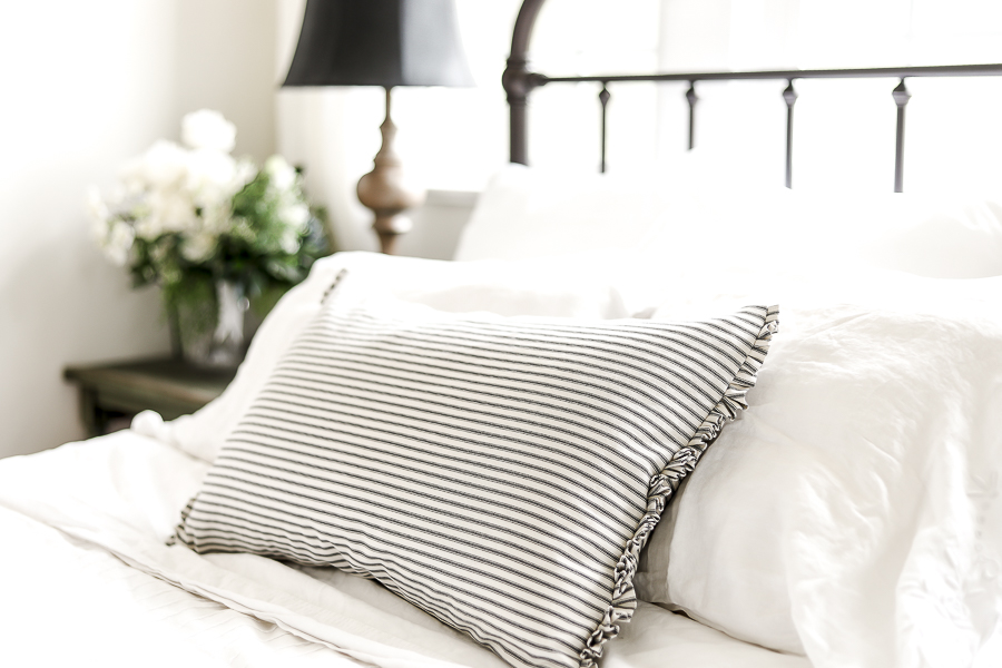 6. SIMPLE TICKING LUMBAR PILLOW WITH RUFFLES