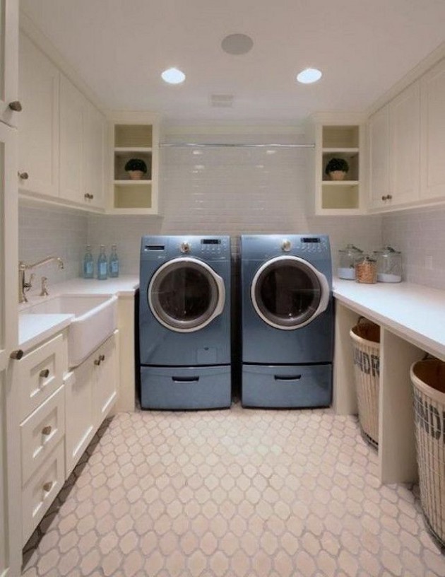 Small laundry should consist of only the regular elements. You should set washing machine and machine for drying, and if you have more space, you can set some basket for storing dirty clothes. If your space allow, you can set also other storage items. Below you can see some creative examples how to decorate properly small laundry room.