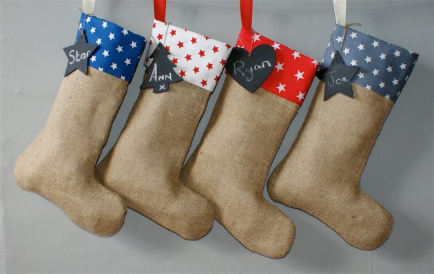 Burlap Personalized Christmas Stockings Scandinavian Style in Red White Blue and Gray Stars with Chalk Board Name Tags
