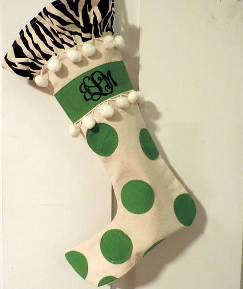 Green Polka Dot Stocking with Monogrammed , Personalized Name and Zebra Trim