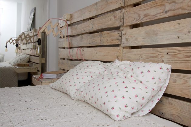 Reclaimed and hand-painted pallet bed frame adds character and charm to a cozy, creative bedroom setup.