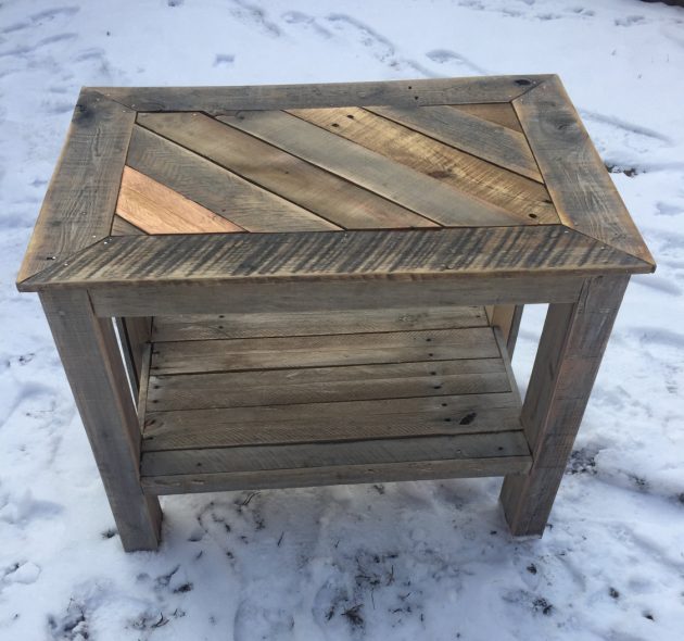 Compact side table made from pallets, featuring rustic paint and open shelving for books and magazines.