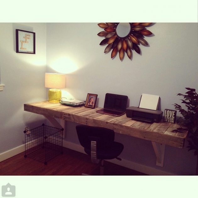 Light-toned DIY pallet desk topped with glass and styled with vibrant decor for a fresh, functional workspace.