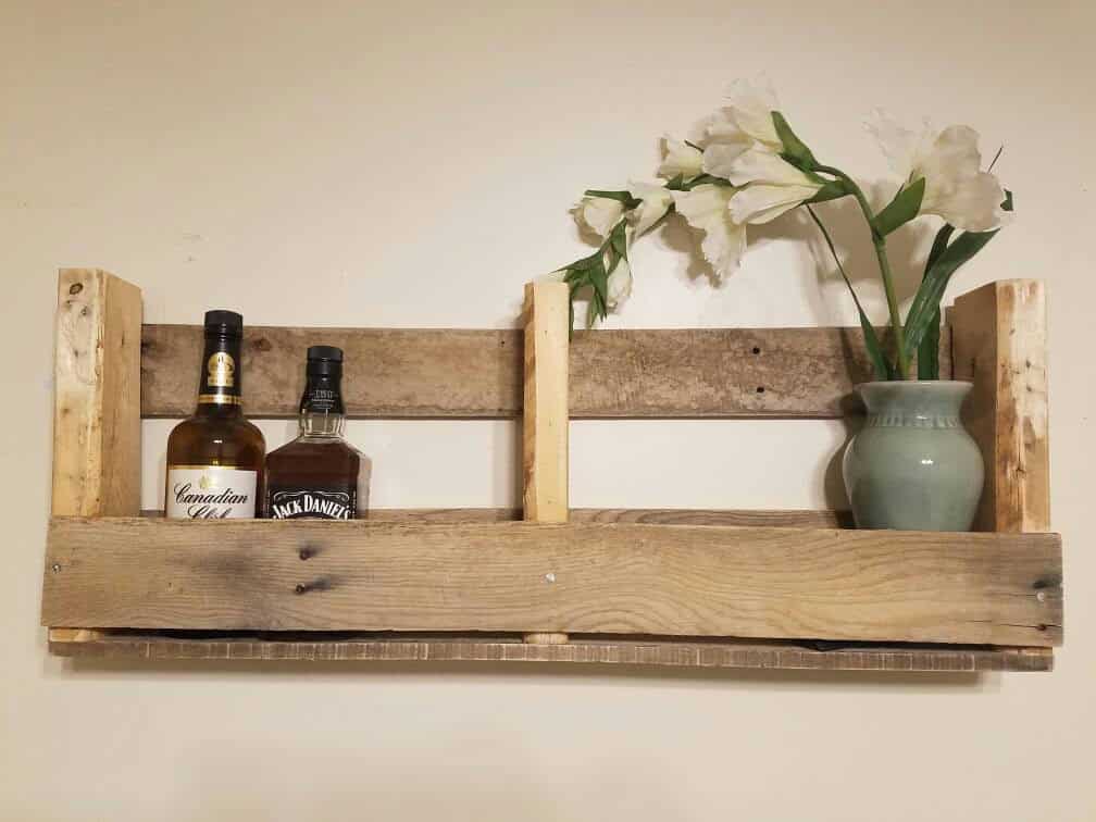 Creative DIY pallet bar with shelving for wine and hanging glass storage, making it perfect for entertaining at home.
