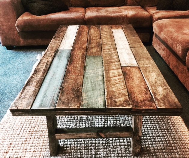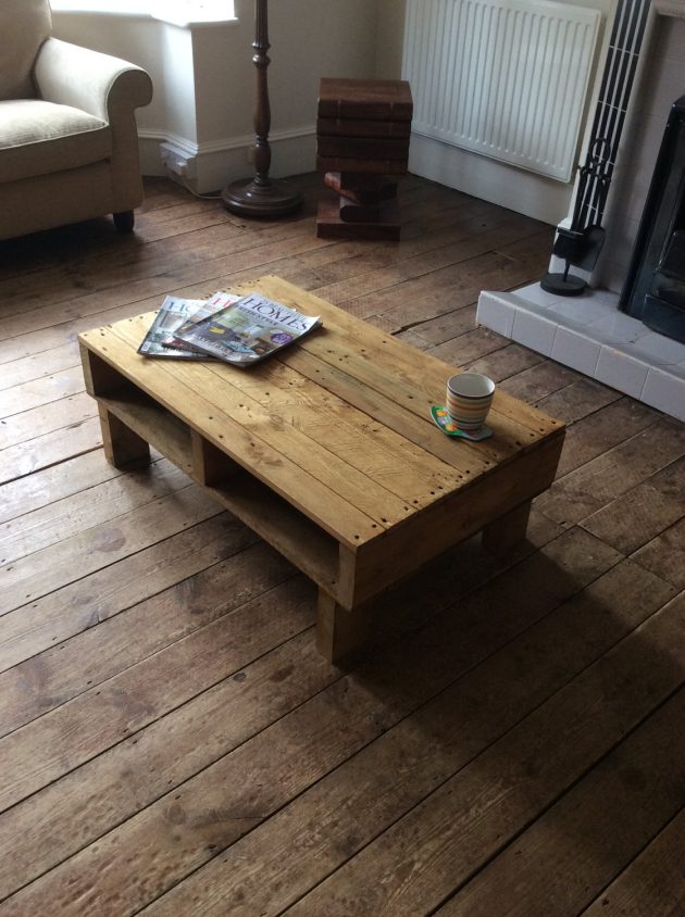 Stylish and mobile coffee table crafted from a sanded pallet, adding rustic-industrial charm to any living area.